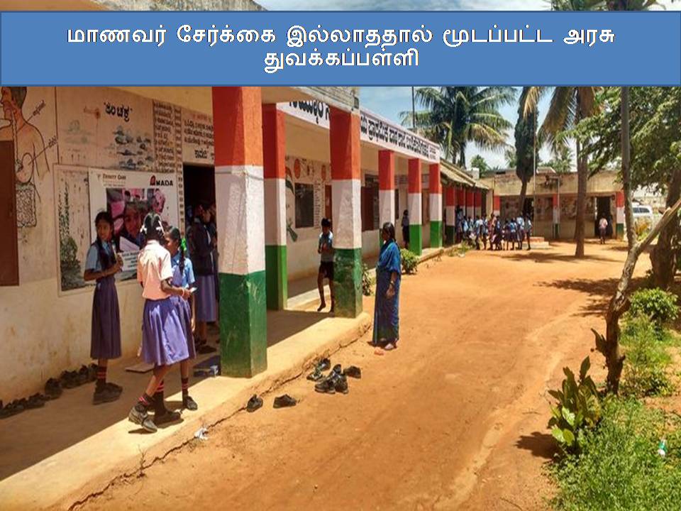 தமிழகத்தின் பல ஊரக பகுதிகளில் அரசு துவக்கப்பள்ளிகளில் மாணவர் சேர்க்கை குறைவாகி வரும் நிலையில், சமீபத்தில் ஒரு அரசு துவக்கப்பள்ளி மாணவர் சேர்க்கை இல்லாத காரணத்தால் மூடப்பட்டுள்ளதாக தகவல் வெளியாகியுள்ளது. கடந்த இரண்டு கல்வியாண்டுகளாக அந்தப் பள்ளியில் ஒரே ஒரு மாணவரும் சேராததால், கல்வித்துறை அதிகாரிகள் பள்ளி நிர்வாகத்தை மூடிவிட்டு, அங்கு பணியாற்றிய ஆசிரியர்களை அருகிலுள்ள பள்ளிகளுக்கு மாற்றியுள்ளனர். இதனால் அந்தப் பகுதியில் இருந்த பெற்றோர்கள் அதிர்ச்சி மற்றும் வருத்தம் தெரிவித்துள்ளனர்.