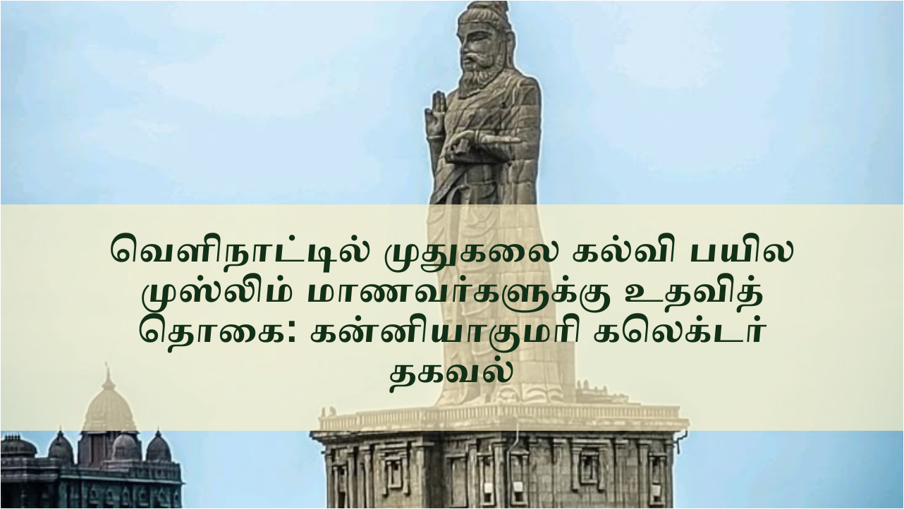 கன்னியாகுமரி மாவட்ட கலெக்டர் சமீபத்தில் வெளியிட்ட அறிவிப்பில், வெளிநாட்டில் முதுகலைப் படிப்பு பயிலும் முஸ்லிம் மாணவர்களுக்கு அரசு சார்பில் உதவித் தொகை வழங்கப்படும் என்று தெரிவித்துள்ளார். இந்த உதவித் தொகை, கல்வி செலவுகளை குறைக்கவும், மாணவர்களுக்கு வெளிநாட்டில் கல்வி தொடரும் வாய்ப்புகளை அதிகரிக்கவும் உதவும் வகையில் அமைக்கப்பட்டுள்ளது. மாணவர்கள் விண்ணப்பங்களை மாவட்ட கல்வி அலுவலகம் வழியாக சமர்ப்பிக்க வேண்டும் என்று கலெக்டர் குறிப்பிட்டார்.