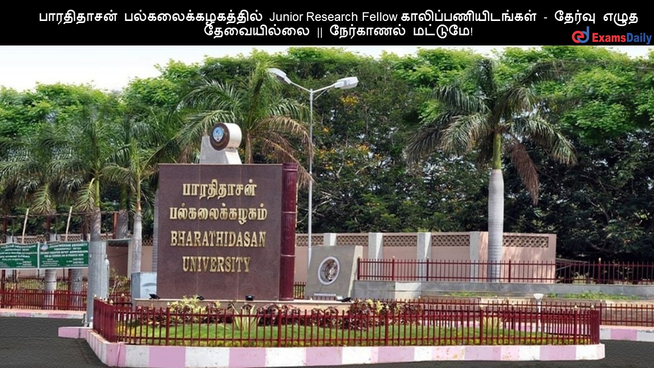 பாரதிதாசன் பல்கலைக்கழகத்தில் Junior Research Fellow காலிப்பணியிடங்கள் – தேர்வு எழுத தேவையில்லை || நேர்காணல் மட்டுமே!