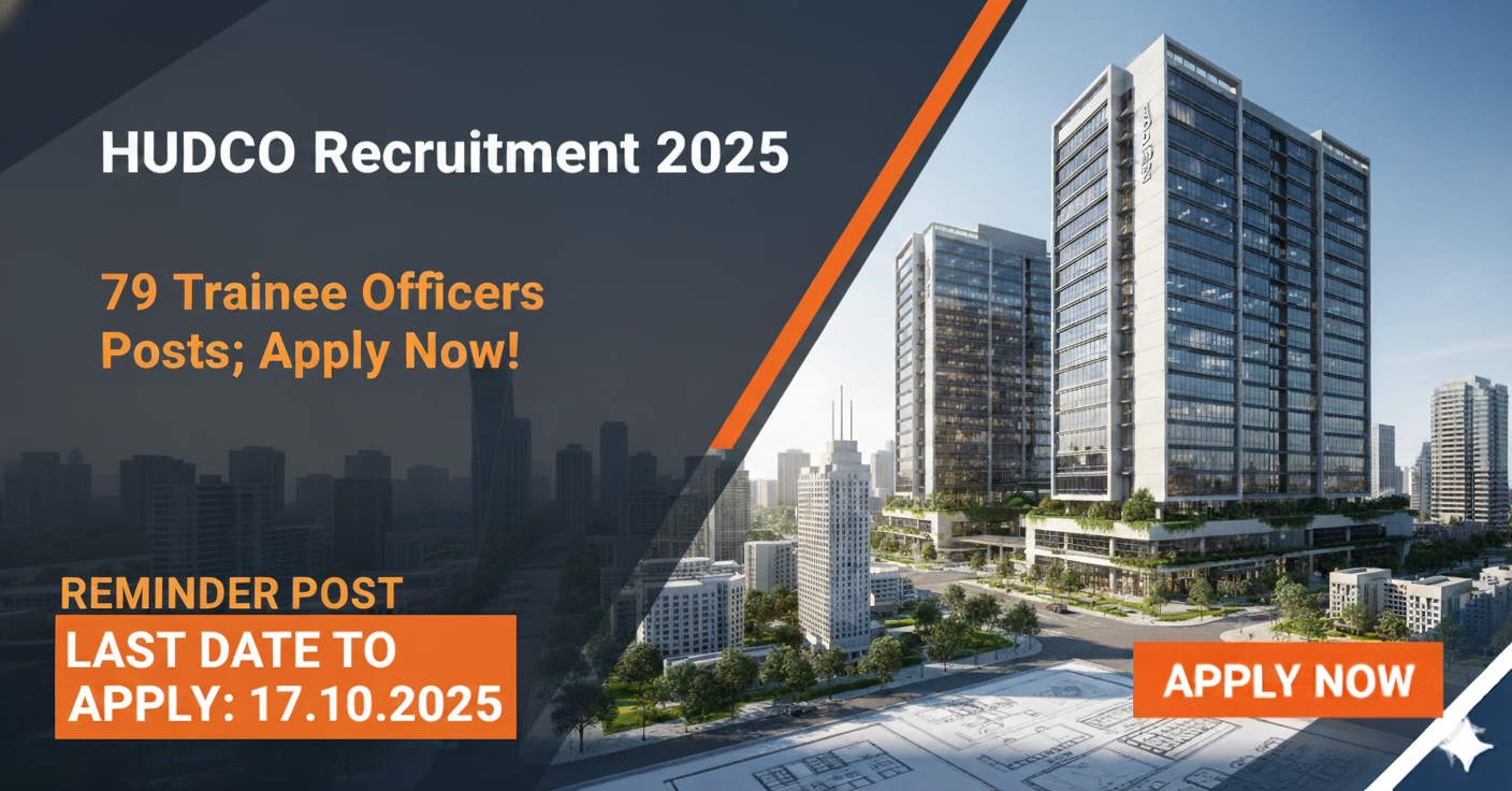 Housing and Urban Development Corporation Ltd. (HUDCO) 2025 ஆம் ஆண்டுக்கான 79 Trainee Officers, Manager, AGM, DGM மற்றும் Senior Manager பணியிடங்களுக்கு ஆன்லைன் விண்ணப்பங்களை அறிவித்துள்ளது. தகுதியும், அனுபவமும் உள்ள விண்ணப்பதாரர்கள் 27 செப்டம்பர் 2025 முதல் 17 அக்டோபர் 2025 வரை அதிகாரப்பூர்வ இணையதளம் hudco.org.in மூலம் விண்ணப்பிக்கலாம். இந்த வேலைவாய்ப்பு அரசு நிறுவனங்களில் நிரந்தர பணியிட வாய்ப்பாகும்.