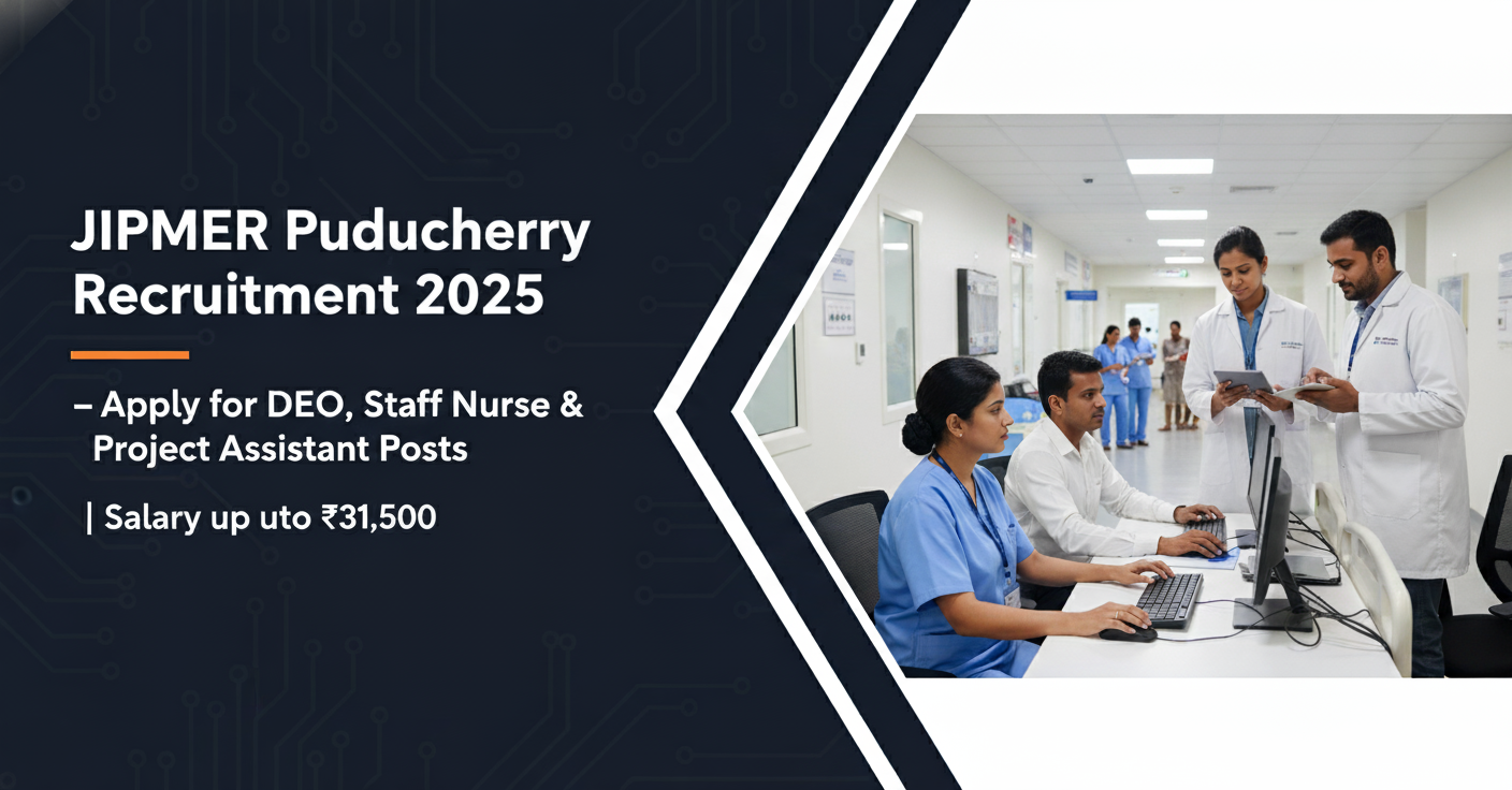 ஜிப்மர் புதுச்சேரி வேலைவாய்ப்பு 2025 – DEO, செவிலியர், திட்ட உதவியாளர் பணியிடங்கள் | மாதம் ₹31,500 வரை சம்பளம்
