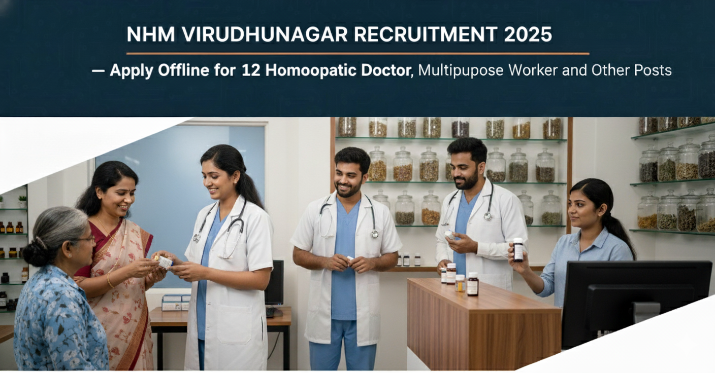 தேசிய சுகாதார இயக்கம் விருதுநகர் (NHM Virudhunagar) 2025-ஆம் ஆண்டிற்கான வேலைவாய்ப்பு அறிவிப்பை வெளியிட்டுள்ளது. இதில் மொத்தம் 12 ஹோமியோபதி டாக்டர், மல்டிபர்பஸ் வொர்க்கர் மற்றும் பிற பணியிடங்கள் நிரப்பப்பட உள்ளன. டிப்ளமோ, 8ஆம் வகுப்பு மற்றும் BHMS தகுதி பெற்ற விண்ணப்பதாரர்கள் ஆஃப்லைன் வழியாக விண்ணப்பிக்கலாம். விண்ணப்பம் 29-10-2025 முதல் 14-11-2025 வரை virudhunagar.nic.in இணையதளத்தில் கிடைக்கும்.