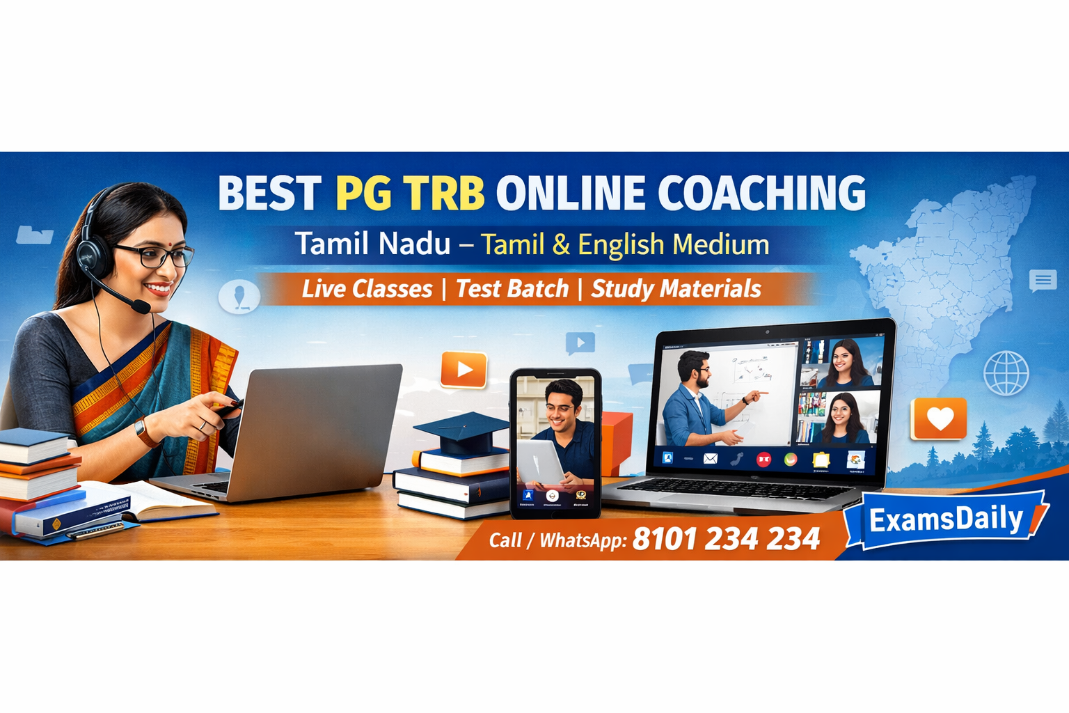 Tamil Nadu முழுவதும் PG TRB exam prepare பண்ணுற மாணவர்களுக்கு, வீட்டிலிருந்தே attend பண்ணக்கூடிய PG TRB Online Coaching classes-ஐ ExamsDaily வழங்குகிறது. Tamil medium & English medium students-க்கு expert faculty மூலம் live classes, recorded videos, study materials, test batches என complete preparation system ஒரே platform-ல் கிடைக்கும்.