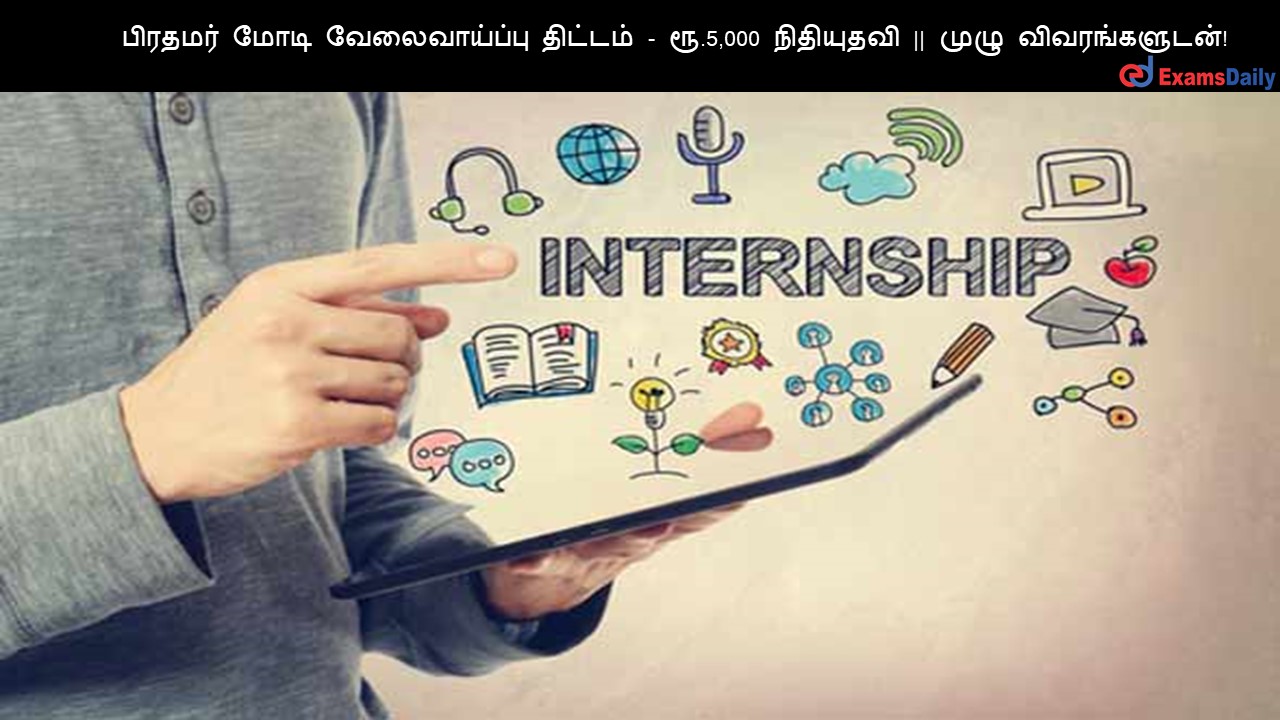 5 ஆண்டுகளில் 1 கோடி இளைஞர்களுக்கு வேலைவாய்ப்பு வாங்குவதை இலக்காக கொண்டு இத்திட்டம் தொடங்கப்பட்டுள்ளது. இத்திட்டத்தின் கீழ், இளைஞர்கள் இந்தியாவின் சிறந்த 500 நிறுவனங்களில் இன்டர்ன்ஷிப் செய்ய வாய்ப்பு கிடைக்கும் என தெரிவிக்கப்பட்டுள்ளது. 21 வயது பூர்த்தியான 24 வயதுக்கு உட்பட்ட 10 வது தேர்ச்சி பெற்றவர்கள் விண்ணப்பிக்கலாம். பயிற்சியில் சேர ஒரு முறை உதவியாக ரூ.6,000 வழங்கப்படும். அதன்பிறகு ஒரு வருடத்திற்கு ஒவ்வொரு மாதமும் ரூ.5,000 நிதியுதவி வழங்கப்படும் என தெரிவிக்கப்பட்டுள்ளது.